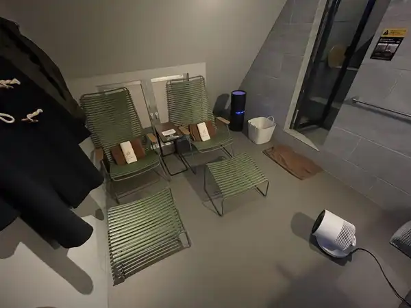 部屋は大体5, 6畳の広さと行ったところです。入るとまず、2台の大きなリクライニングチェアが。フットレストやサーキュレーターも付いていて贅沢。