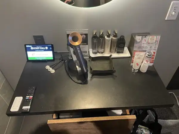 アメニティは化粧水や風量最強のダイソンのドライヤーに加えて、サウナ室で音楽を流せるBluetoothスピーカーもあります。サウナで好きな音楽が聞けますね。