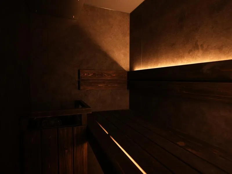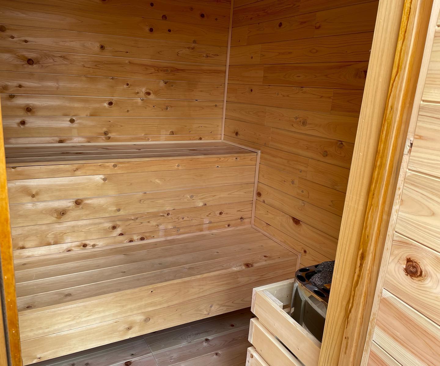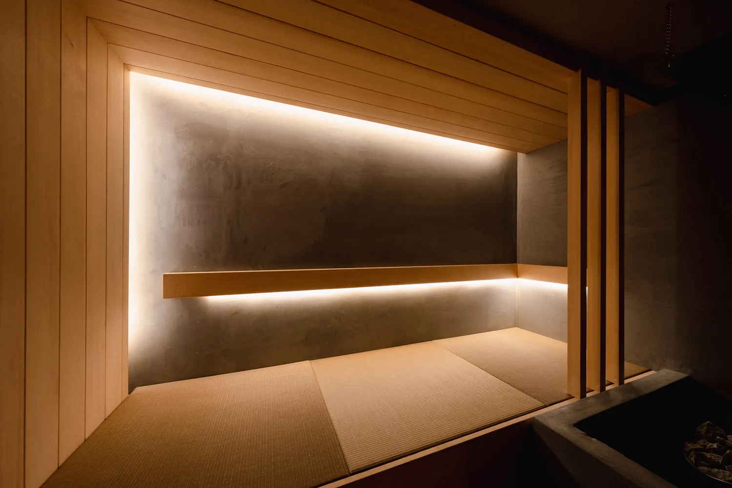 サウナ室は、ゆったり過ごせるよう、寝転べる座面の広さと、スモークサウナをイメージした暗い室内になっています。